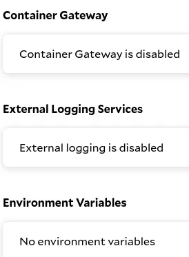 3. Do not enable Container Gateway, Logging Services or Environment Variables: