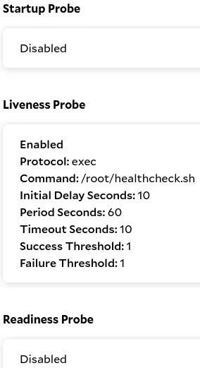 4. Enable Liveness Probe with the following settings. Do not enable other probes.